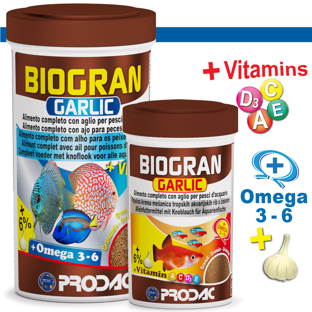Complete feed in granules for all kind of tropical aquarium fish. The blend of different high quality ingredients with the addition of garlic, which strengthens the body of fishes and helps the digestion process, is the foundation of this special feed.